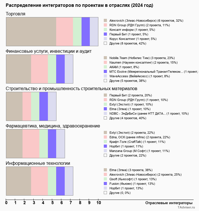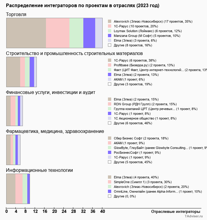 Согласно информации о проектах, содержащейся в базе TAdviser, за 2023-2025 гг. CRM-системы чаще всего внедрялись в торговле, в сфере финансовых услуг, в строительстве, ИТ и здравоохранении. На долю этих отраслей приходится 51% от всех реализованных проектов, известных TAdviser.