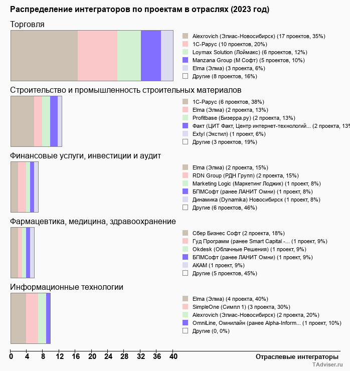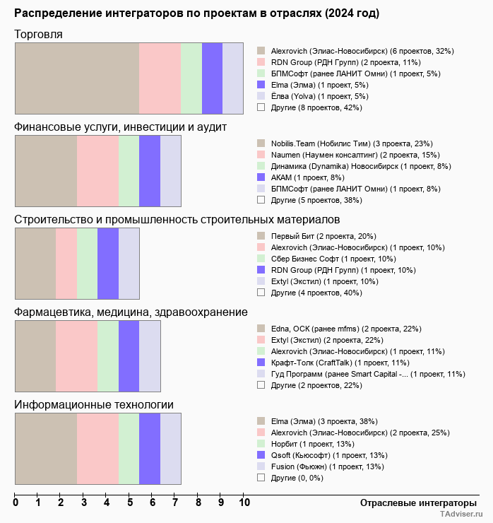 Отраслевое распределение по количеству проектов внедрений